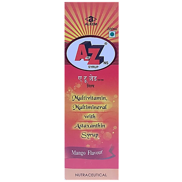 A To Z NS Mango Flavour Syrup fulfils your daily dose of multivitamins and minerals intake and improves your general health and well-being. It is composed of Astaxanthin extract, Vitamin B complex, Vitamin C, Vitamin A, Biotin, Zinc, Manganese, Iodine, Selenium, and Molybdenum. It treats nutritional deficiencies caused due to poor intake of nutrients from food or other illnesses. It further boosts immunity and helps the body fight against various infections. It also helps the body overcome weakness, fatigue, and stress by increasing energy levels. It protects the cells against free radicals or toxins in the body due to pollution, smoking, ultra-violet rays, etc.