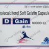 D Gain Capsule 1000IU is a vitamin supplement primarily used to treat vitamin D deficiency. Vitamin D deficiency occurs when your body has low Vitamin D levels and is caused by inadequate nutrition, intestinal malabsorption, or lack of sunlight exposure. It effectively treats various conditions, including low calcium levels, osteoporosis (weak bones), latent tetany (a muscle disease characterized by low blood calcium levels), and rickets or osteomalacia (softening of bones due to low calcium levels).
