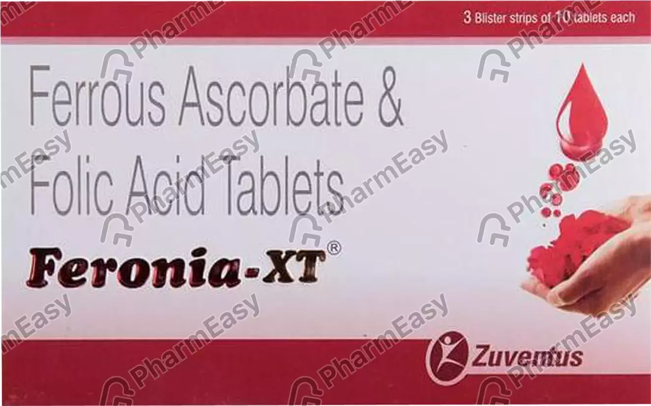 Feronia-XT Tablet is a combination of two drugs: Ferrous ascorbate and folic acid. Feronia-XT Tablet works by increasing the production of red blood cells (RBCs) and haemoglobin (a protein) in the body. As a result, an adequate number of RBCs is produced in the body so that each tissue gets a sufficient supply of oxygen.