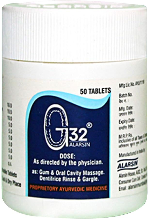 G 32 Tablet contains Bakul, Chok, Katha, Laving , Chiknisopari, Fatakdi, Miaphala, Elaichi ,Sonageru, Jira, Majith, Pushanbhed , Vavading, Pipal Lakh, Samudraphen, Vajradanti, Taj, KaliMirch, Sajikhar, Kulinjana, Pipar, Kapur as a combination of ingredients.