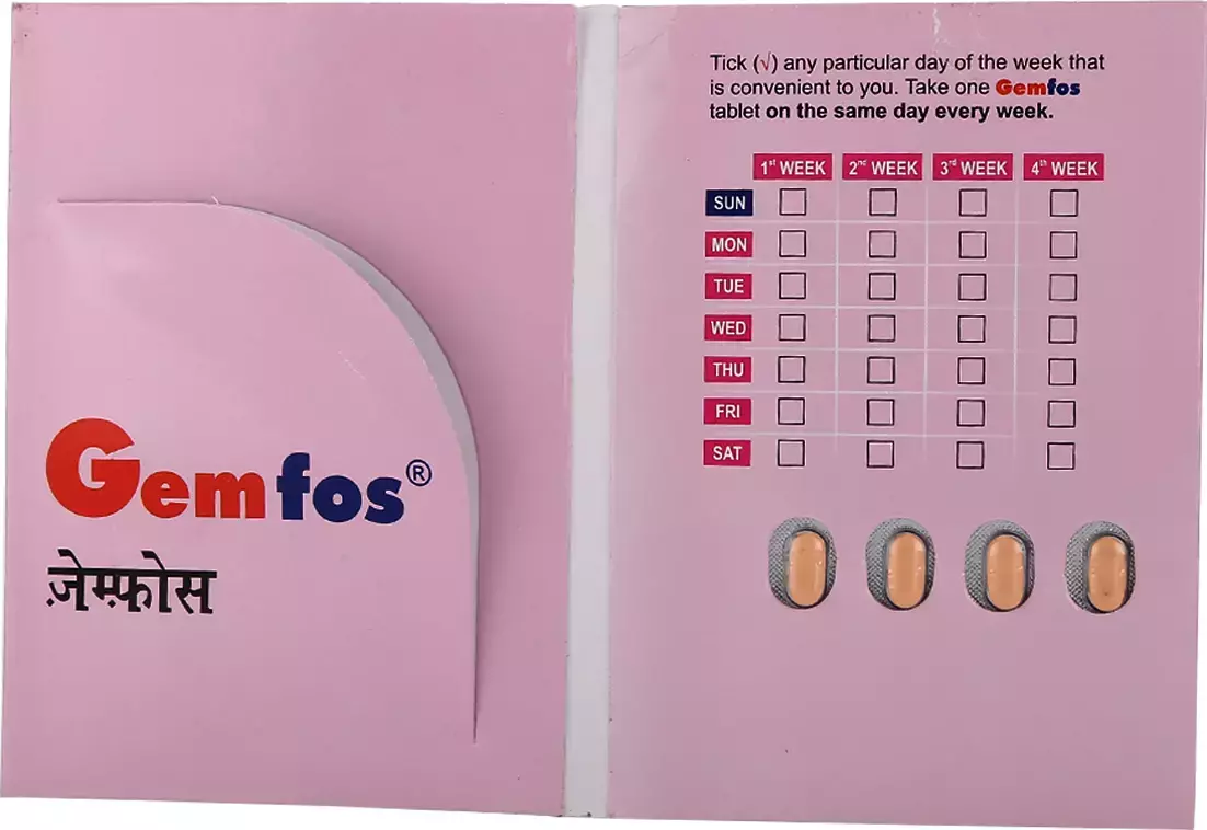 Gemfos Tablet is best taken without food. You should take it regularly at evenly spaced intervals as per the schedule prescribed by your doctor. Taking it at the same time every day will help you to remember to take it. Do not stop taking it until you have finished, even when you feel better. It may take several days to get the full benefit of this drug. Gemfos Tablet is only part of a programme of treatment that may also include changes to your diet and taking calcium and vitamin supplements.