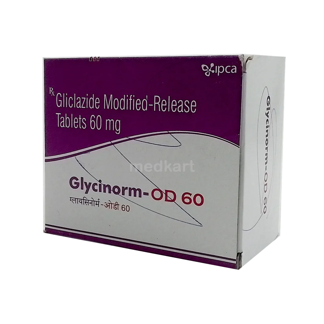 GlYCInorm -OD 60 Tablet MR may be prescribed alone or along with other medicines. It should be taken with food. Take it regularly at the same time each day to get the most benefit. Your doctor will decide what dose is best for you, which may change from time to time according to how it works. Continue using this medicine as prescribed, even if you feel fine or your blood sugar levels are stable. If you stop it without consulting your doctor, your blood sugar levels could rise and put you at risk of kidney damage, blindness, and nerve problems.