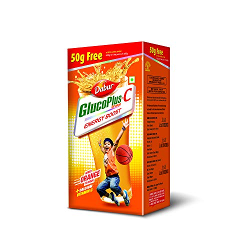 Dabur GlucoPlus C Orange powder is a vegetarian drink mix that dissolves quickly in water to create a refreshing beverage.