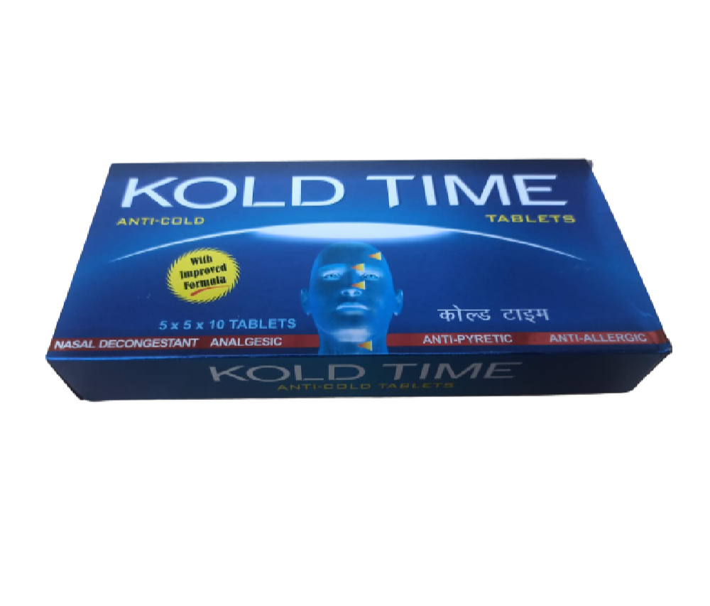 Kold Time 10 mg/500 mg/30 mg Tablet is used in the treatment of common cold symptoms like runny nose, stuffy nose, sneezing, watery eyes and congestion or stuffiness. It is also used to relieve pain and fever.