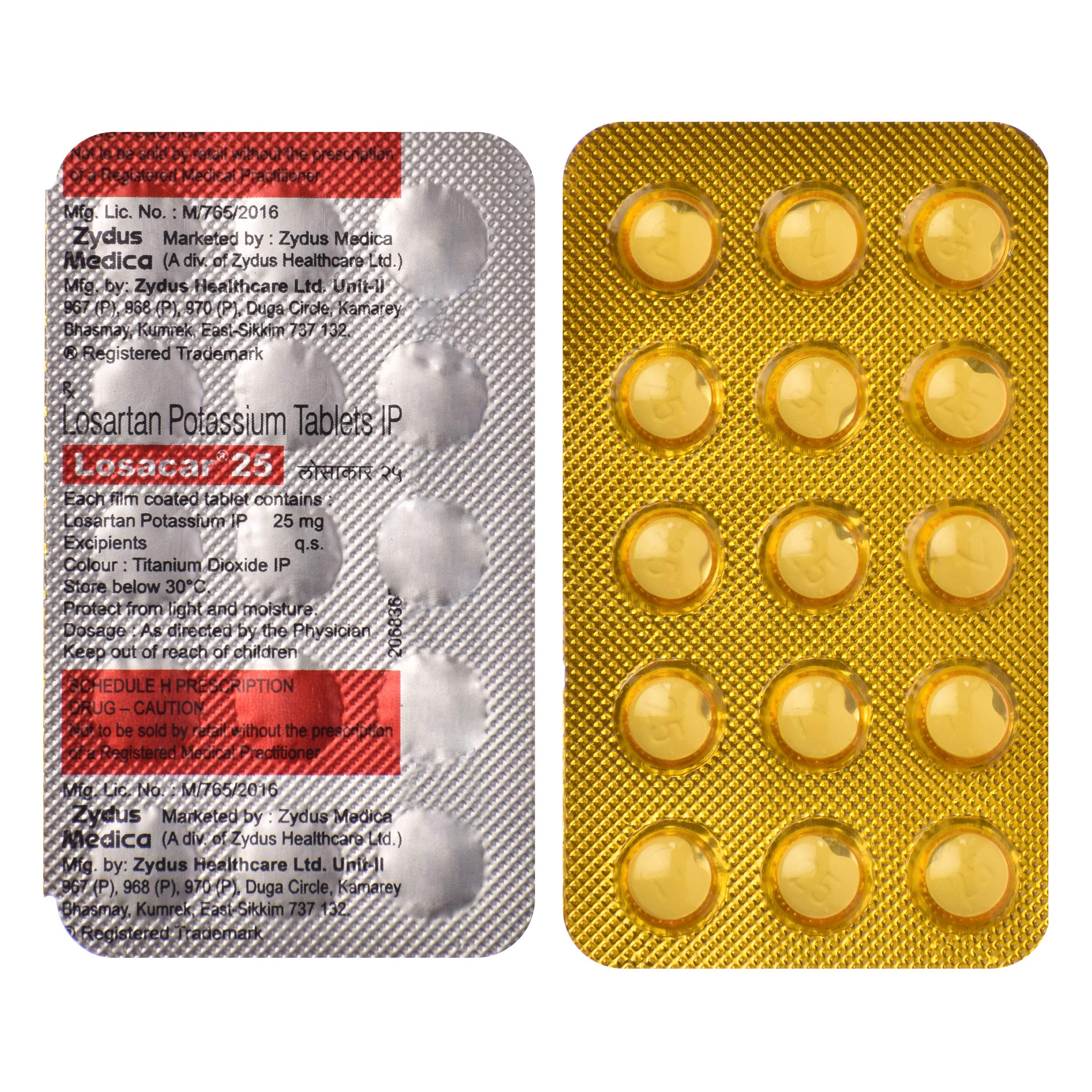 Losacar 25 Tablet can be prescribed either alone or in combination with other medicines. It may be taken with or without food during the day or at night. However, try to take it at the same time each day to get the most benefit. It is important to continue taking it regularly even if you feel well or if your blood pressure is controlled. Most people with high blood pressure do not feel ill, but if you stop taking this medicine, your condition could get worse. This is a widely used medicine and is considered safe for long-term use.