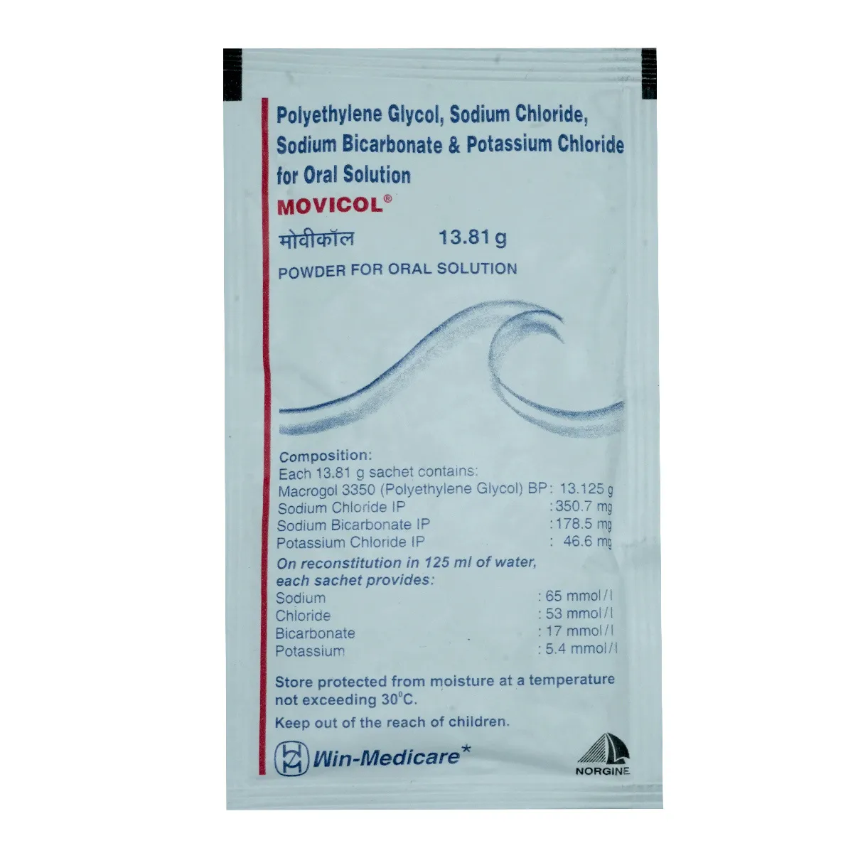 Movicol Sachet 13.81 gm contains Polyethylene glycol, Potassium chloride, Sodium bicarbonate, and Sodium chloride. Movicol Sachet 13.81 gm works by drawing water into the intestine, softening stools, and making them easier to pass. It also helps replenish electrolytes.