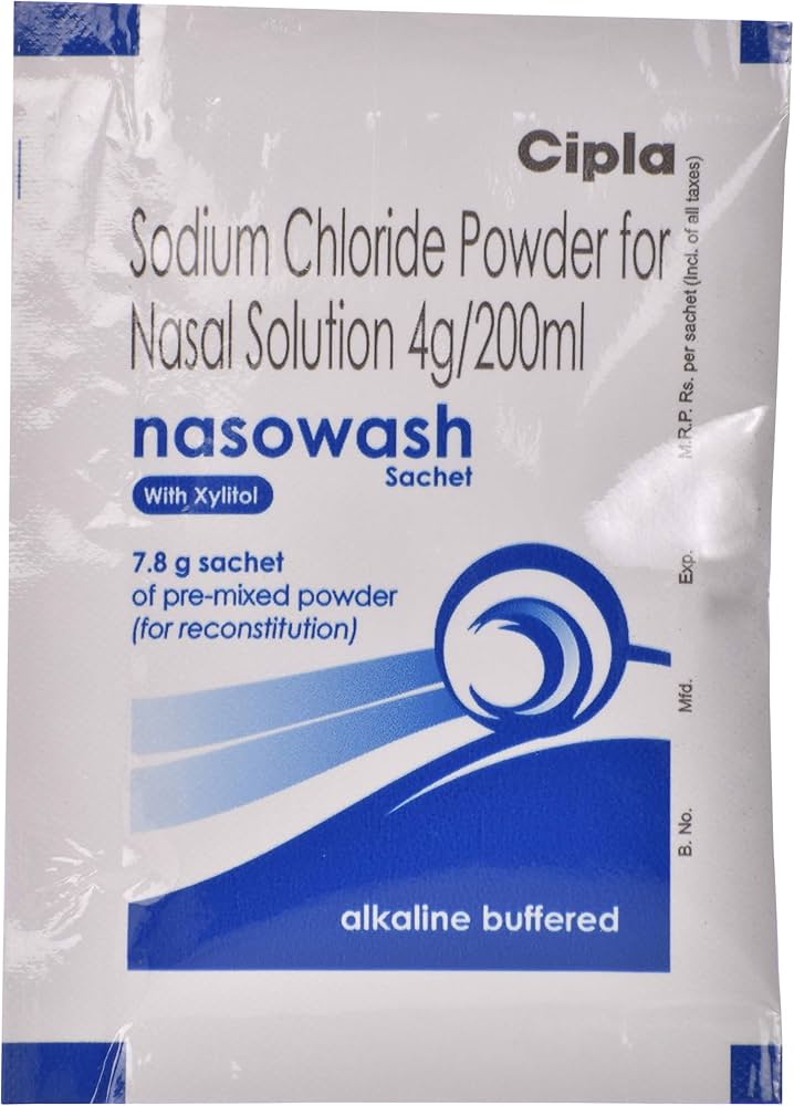 Nasowash Powder for Nasal Solution (7.8 gm sachet) by Cipla is a medical-grade formulation designed to be mixed with water for nasal irrigation (nasal wash or sinus rinse). It is specifically used to alleviate nasal congestion, remove mucus, and clear nasal passages, especially in cases of allergies, colds, or sinus infections.