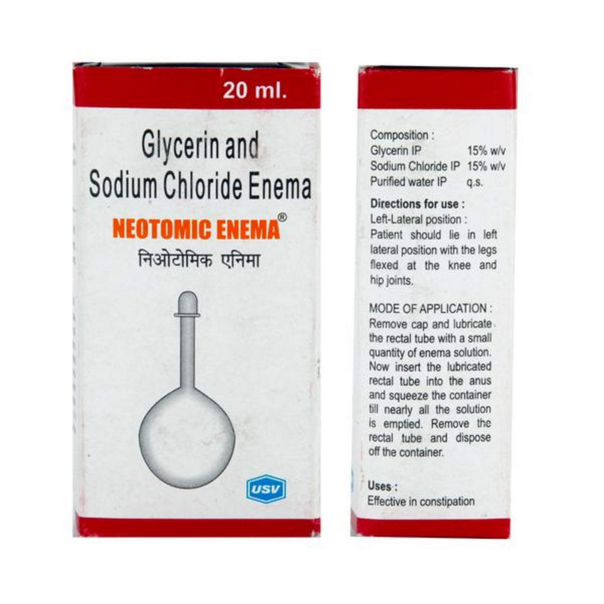 Neotomic Enema is a combination of Glycerin and Sodium Chloride, used to treat constipation. It is also used in people who are bed-ridden for easy defecation (passing of stool from the body). This medicine may also be used by the doctor to empty the bowel before undergoing certain surgery or colonoscopy (a procedure to examine the large intestine and rectum) and for post-operative care. Neotomic Enema works by drawing water into the colon (large intestine) that softens the stool and promotes movement of the intestine, thus allowing easy passage of the stool. Neotomic Enema may cause side effects like vomiting, stomach irritation, cramps, and irritation and burning sensation at the site of application. Consult your doctor if these side effects are getting persistent or worse.