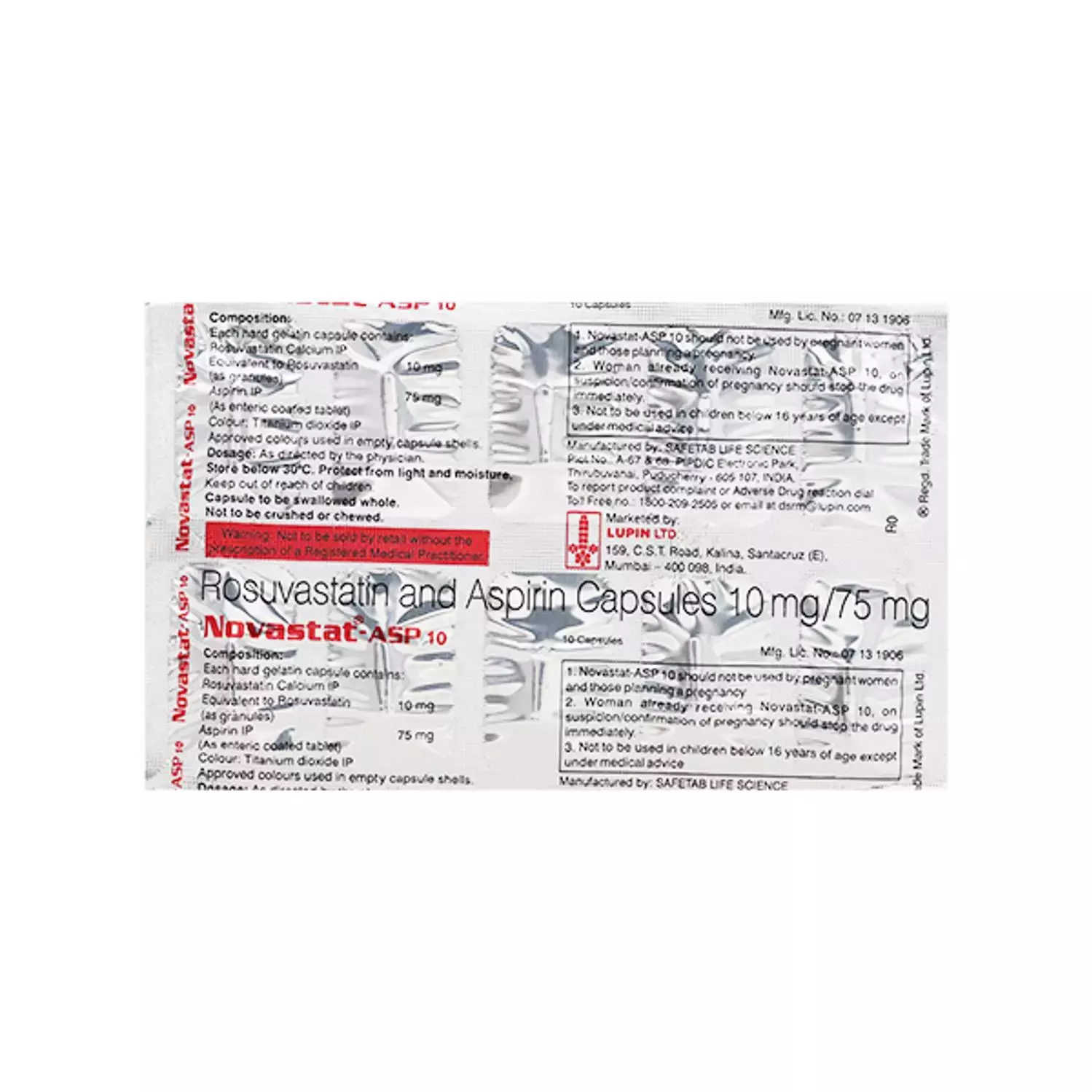Take Novastat Asp 10mg/75mg Capsule with food to help prevent stomach upset. Use it exactly as prescribed by your doctor and try to take it at the same time every day to maintain consistent levels in your body. The dose and duration will depend on your medical condition and response to treatment.