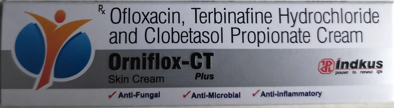 Orniflox CT Cream (15gm) is a combination topical medication containing Terbinafine, Clobetasol, Ofloxacin, and Ornidazole, used to treat mixed skin infections caused by fungus and bacteria. It acts as an anti-infective with steroids to reduce inflammation, itching, redness, and swelling in conditions like eczema or dermatitis.