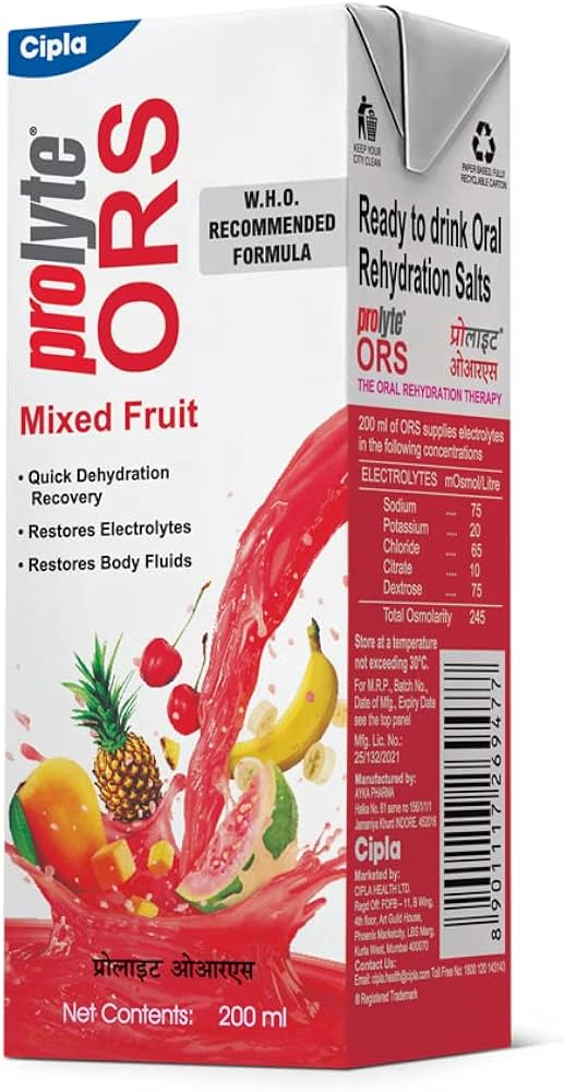ORS Mixed Fruit Drink (200 ml) is a ready-to-drink oral rehydration solution designed to rapidly replenish fluids and electrolytes (sodium, potassium) lost due to diarrhea, vomiting, fever, or excessive sweating. It helps restore the body’s natural balance, prevents dehydration-related fatigue, and offers a pleasant flavor for easier consumption.