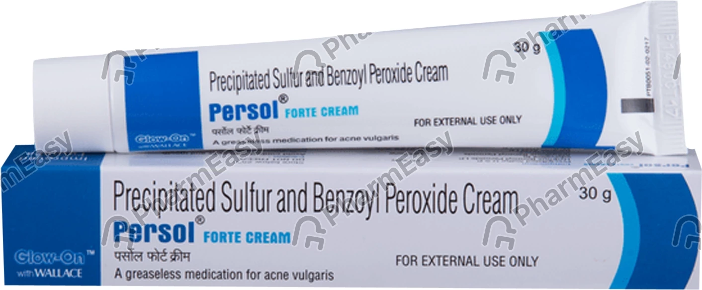 Persol Forte 10 % Cream is an antiseptic that is effectively used on the skin to treat acne (pimples, blackheads and whiteheads) on your face, back and chest. It works by stopping the growth of bacteria on your skin. Persol Forte 10 % Cream reduces painful lumps and clears the dirt and excess oil from your skin. Persol Forte 10 % Cream shows side effects like dry skin, redness of the skin, itching, skin peeling and burning sensation at the application site. Do not use Persol Forte 10 % Cream if you are previously allergic to it. Contact your doctor immediately if you notice any side effects. Persol Forte 10 % Cream has to be used as per your doctor’s instructions. Persol Forte 10 % Cream is not recommended for use in children below 12 years of age. Consult your doctor before using Persol Forte 10 % Cream if you are pregnant or are breastfeeding.