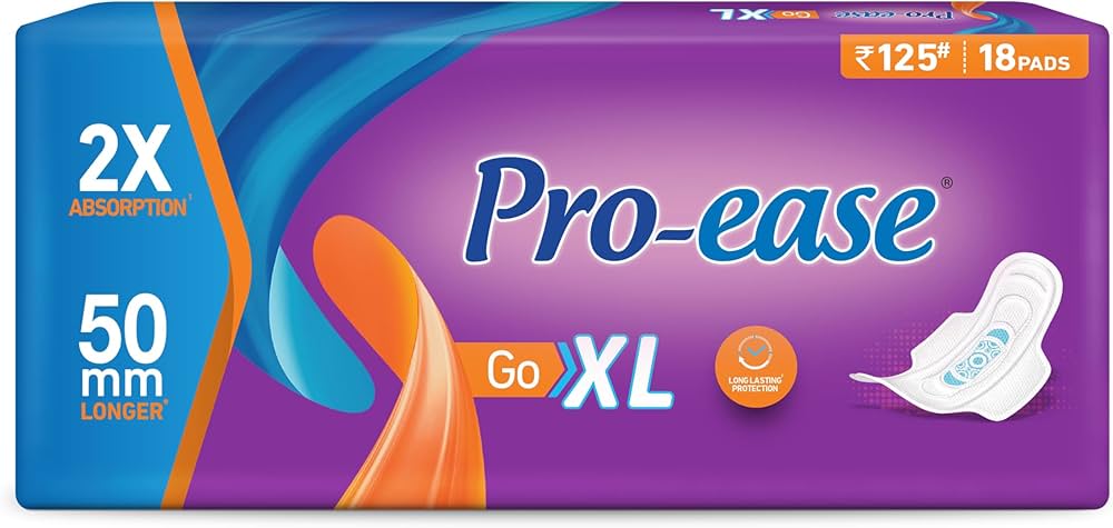 Pro-ease Go XL (often found in 18 pcs packs) are designed for superior comfort, high absorbency, and all-day, long-lasting protection during menstruation. They are 280mm long and 50mm larger than regular pads, making them suitable for heavy flow days and overnight use.