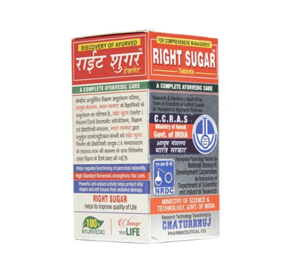 Right Sugar tablets (120 count, by Chaturbhuj Pharmaceuticals) are an Ayurvedic, polyherbal formula developed by the Central Council for Research in Ayurvedic Sciences (CCRAS), under the Ministry of Ayush, Government of India. They are designed to manage blood sugar levels, support pancreatic function, and reduce diabetes-related fatigue.